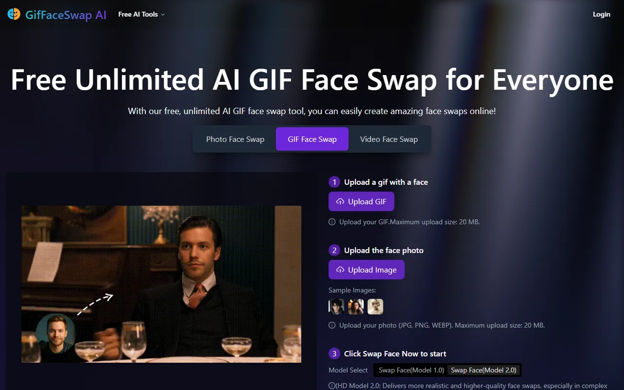 Unlimited free AI-powered GIF face swapping with seamless, realistic results and easy, cloud-based processing.