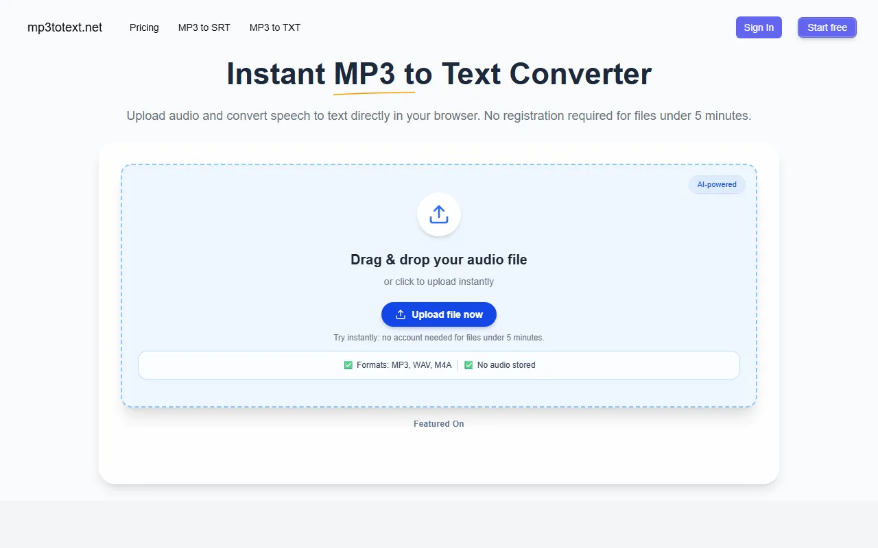 mp3totext.net: fast, easy in-browser MP3 transcription with AI accuracy—no signup required.