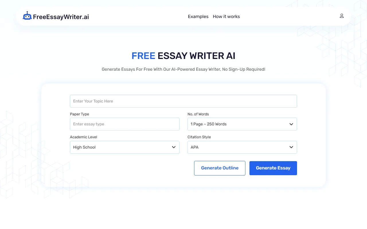 FreeEssayWriter.ai creates instant, high-quality, plagiarism-free essays with grammar and citation support.