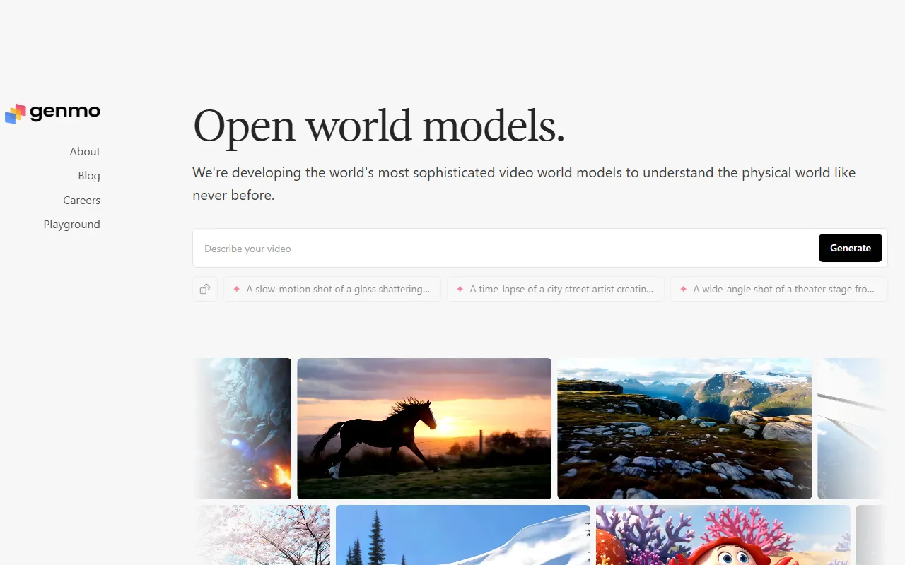 - Generative video: The generative video functionality within Genmo combines intelligent automation with user control, striking a balance between efficiency and customization that allows designers, artists, and creative professionals to maintain creative oversight while saving time.