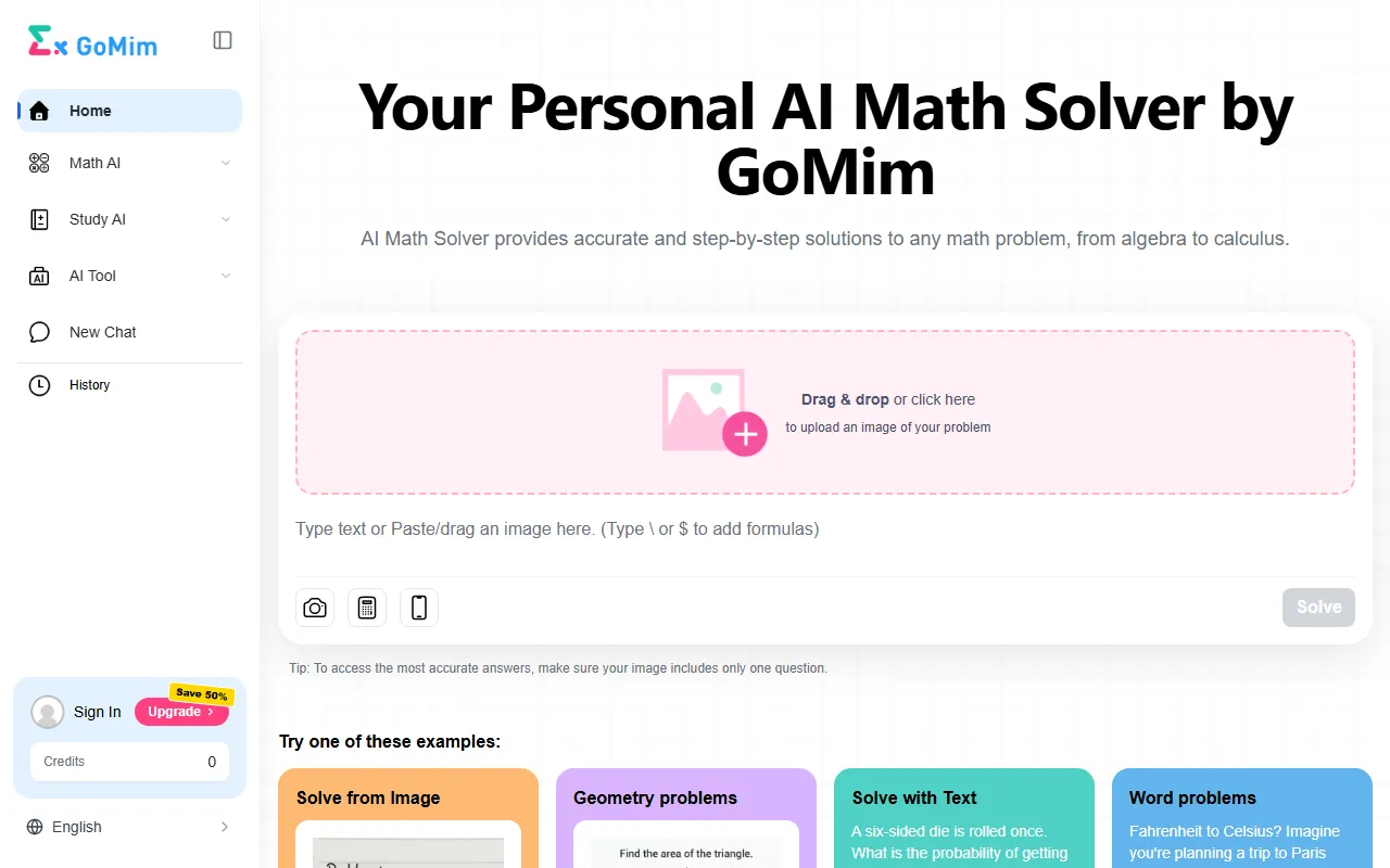 GoMim: AI-powered math solver offering step-by-step solutions, photo input, and multilingual support.