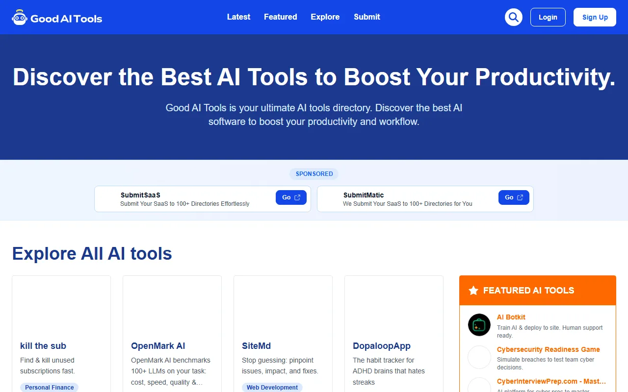 The free model means the barrier to entry is nonexistent, so there is little risk in giving it a try and seeing how it fits into your workflow. In today's fast-moving landscape, having the right AI tools in your arsenal is increasingly becoming a competitive necessity rather than a luxury, and Good AI Tools: Your Go-To Directory for the Best AI Tools to Boost Productivity and Automate Tasks makes a compelling case for inclusion.