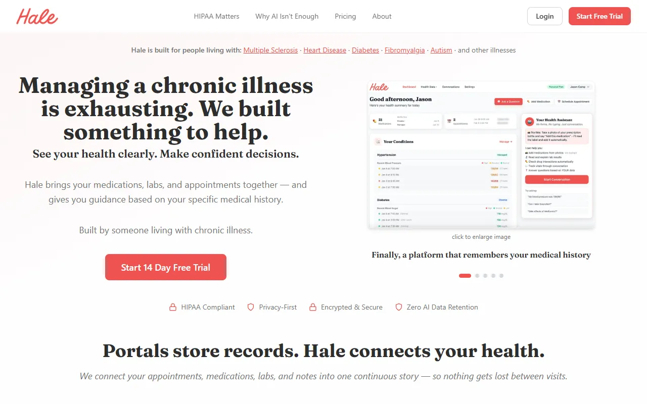 Hale is a HIPAA-compliant AI assistant that remembers your health details, tracks medications, and supports caregivers managing complex medical needs.