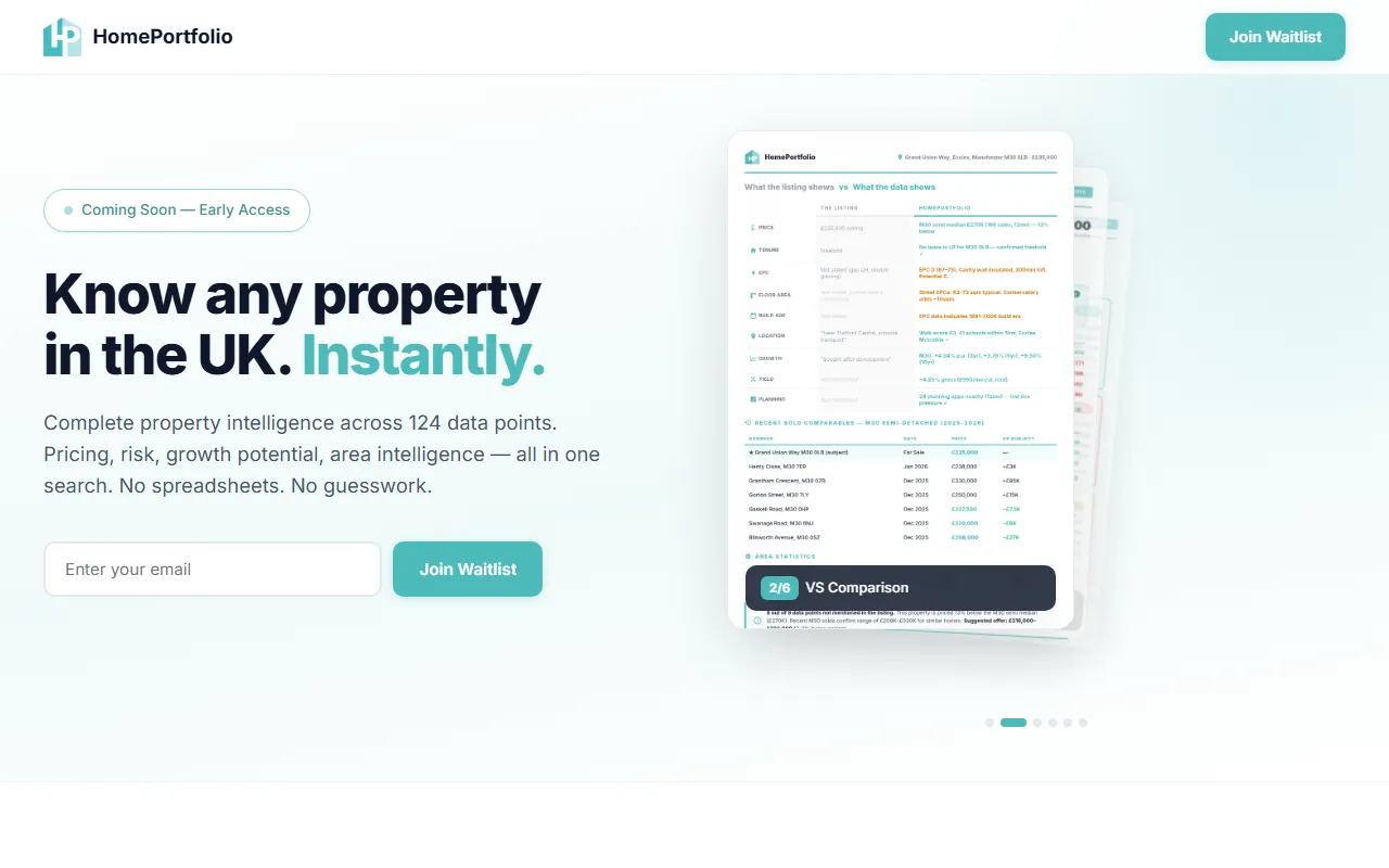 HomePortfolio offers instant AI-driven UK property insights, predictive analytics, and secure team collaboration.