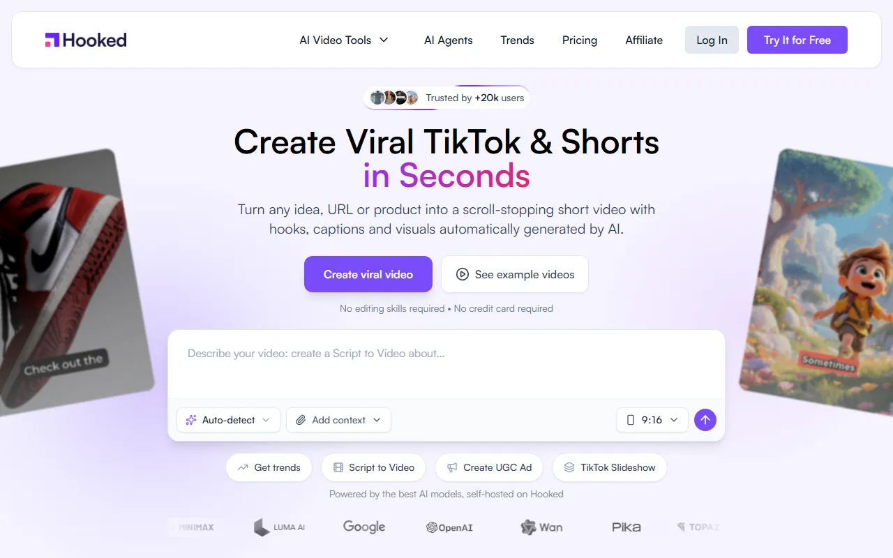Hooked uses AI to create viral TikTok videos fast, with trending guides and easy editing.
