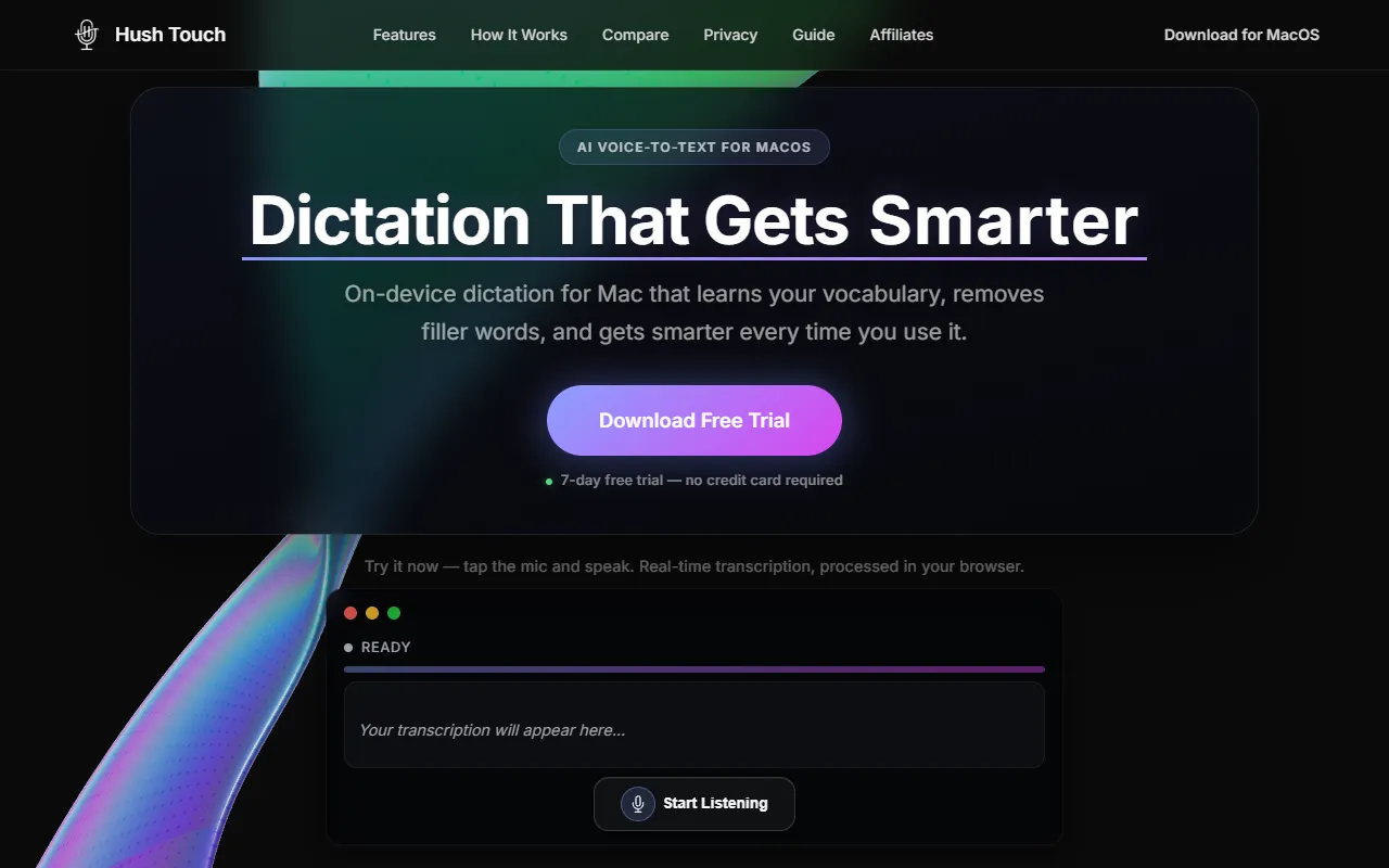 Hush Touch: Fast, private macOS AI dictation with dual engines, smart editing, and adaptive learning.