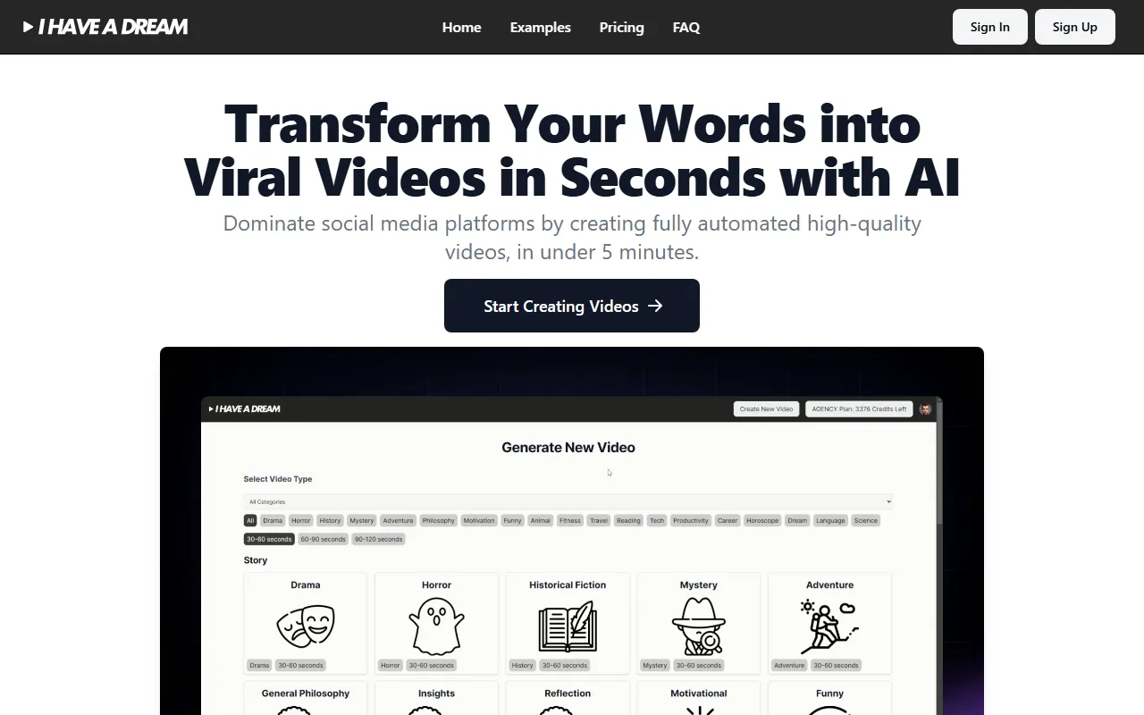 For designers, artists, and creative professionals seeking smarter ways to handle image generation and visual design, I Have a Dream presents an intriguing proposition. Create engaging videos effortlessly in 3 minutes with AI-driven scripts, visuals, and editing automation. The platform aims to bridge the gap between complex AI technology and practical, everyday utility, making advanced capabilities accessible without requiring deep technical expertise.