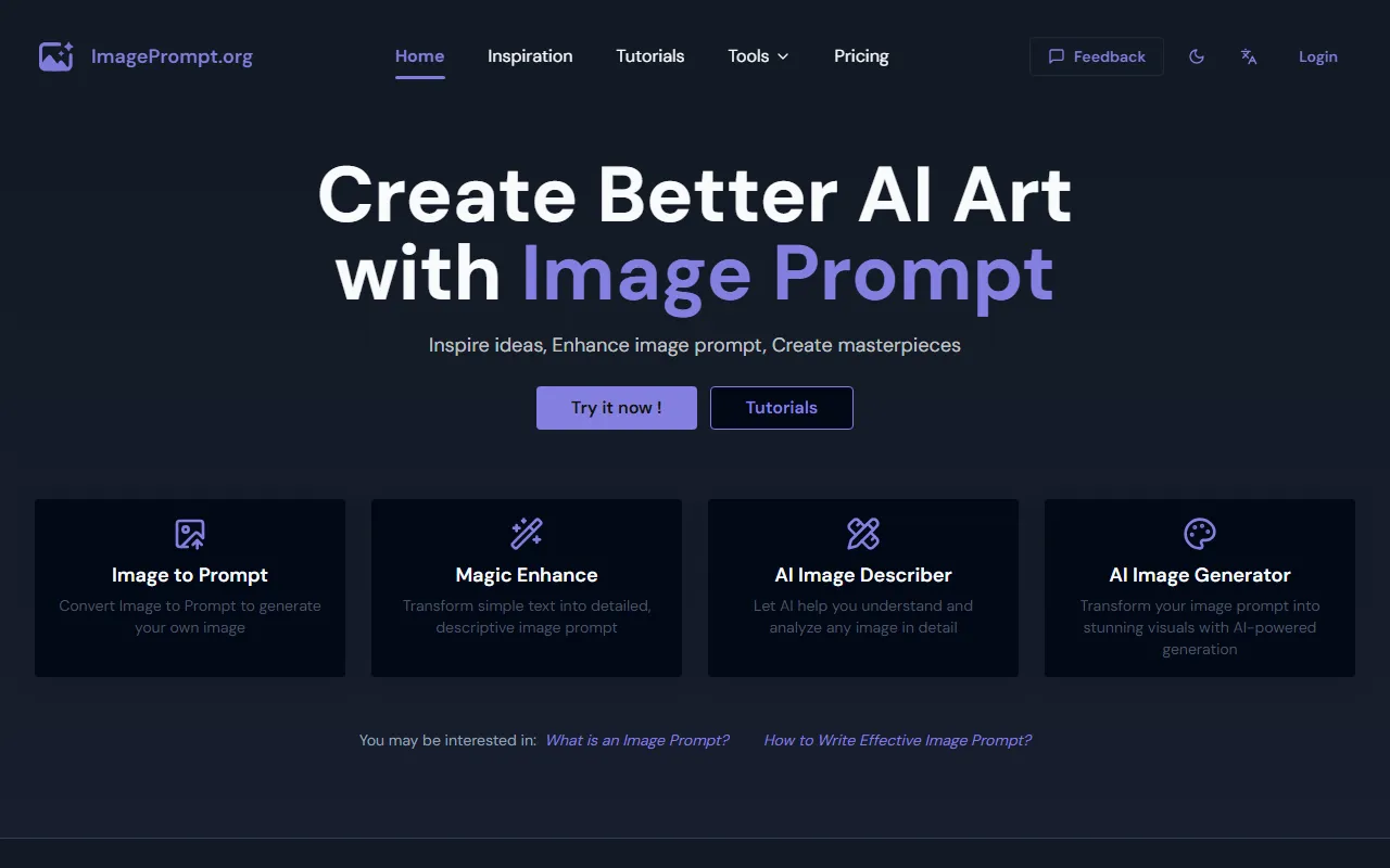 - Art inspiration: Image Prompt includes a dedicated art inspiration engine that processes your inputs intelligently. The system learns from each interaction, delivering increasingly personalized and accurate results the more you use it.