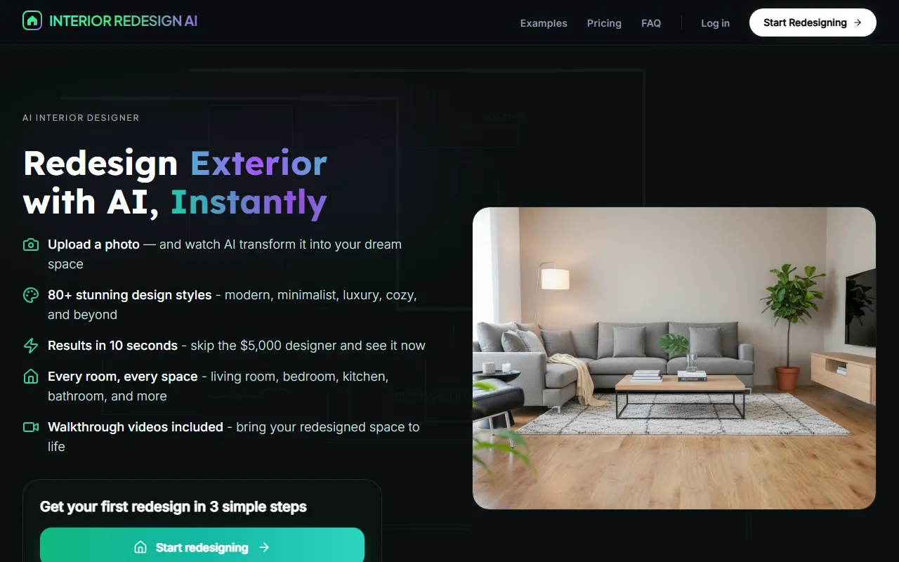 Interior Redesign AI instantly creates realistic room and exterior redesigns for planning and staging.