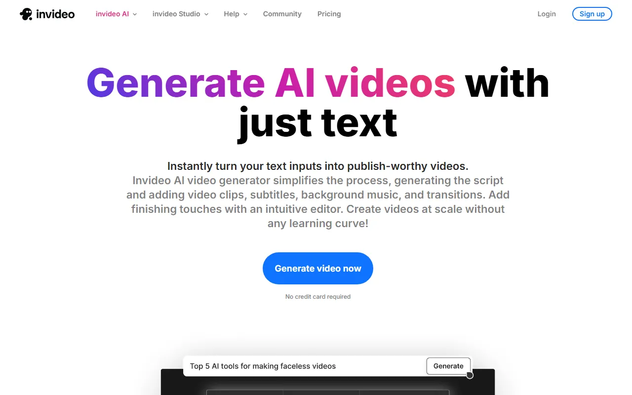 - Video generation: With built-in video generation capabilities, InVideo helps marketers, growth hackers, and brand managers tackle this aspect of their workflow head-on. The AI-driven approach ensures consistent, high-quality output every time while reducing manual effort significantly.