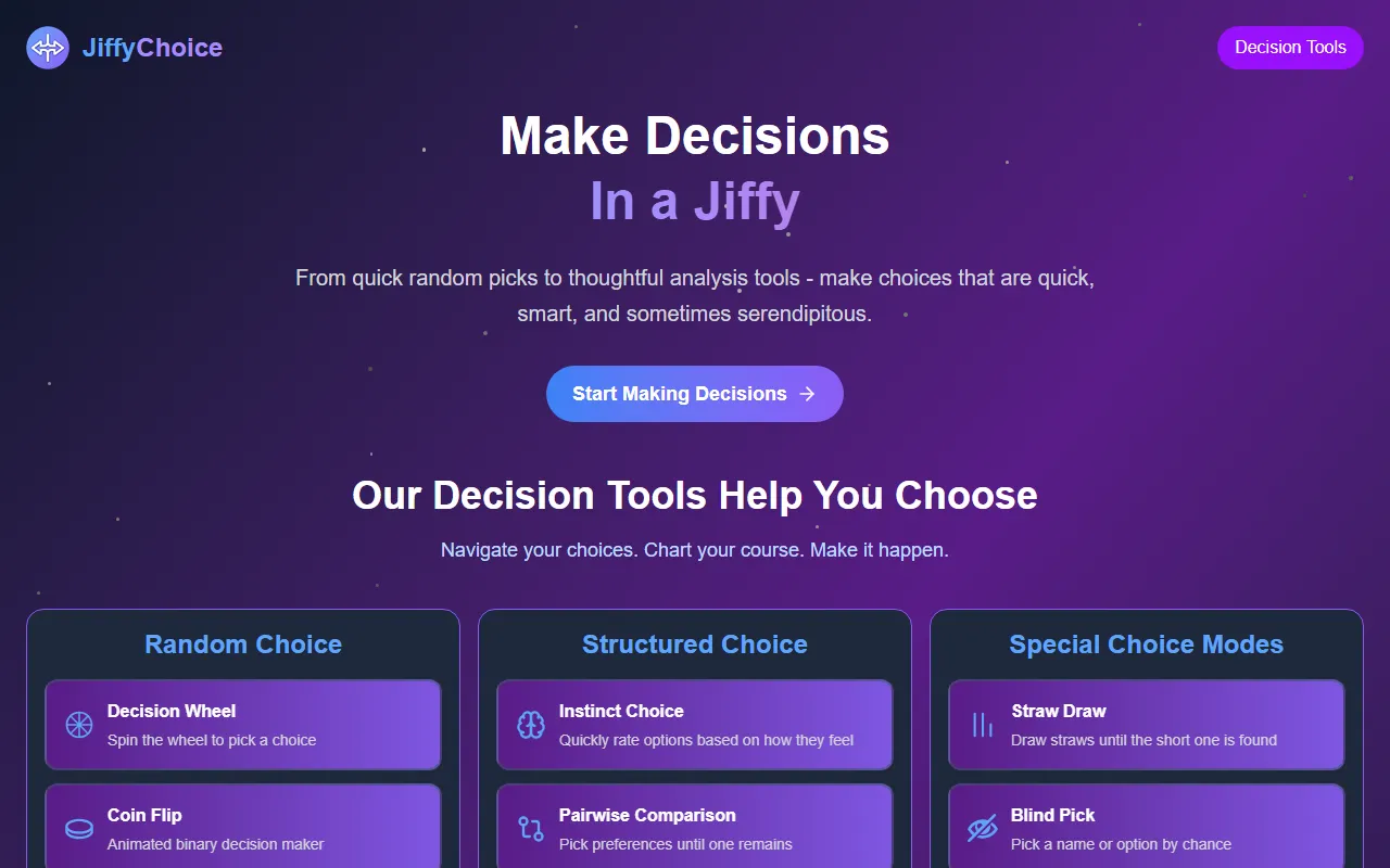 JiffyChoice offers free, easy decision-making tools from quick picks to structured analysis.