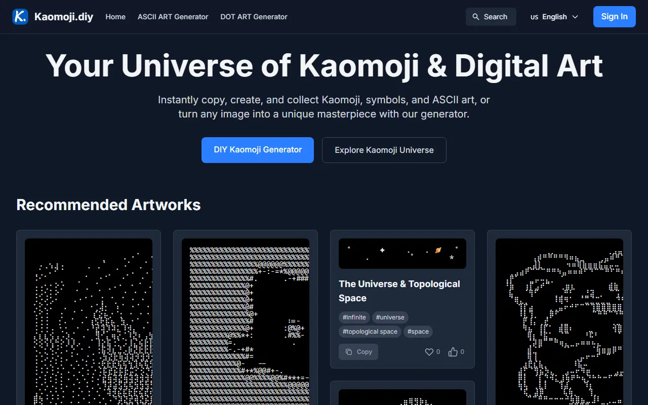 Kaomoji.diy creates free, easy kaomoji and converts images to ASCII or dot art online.