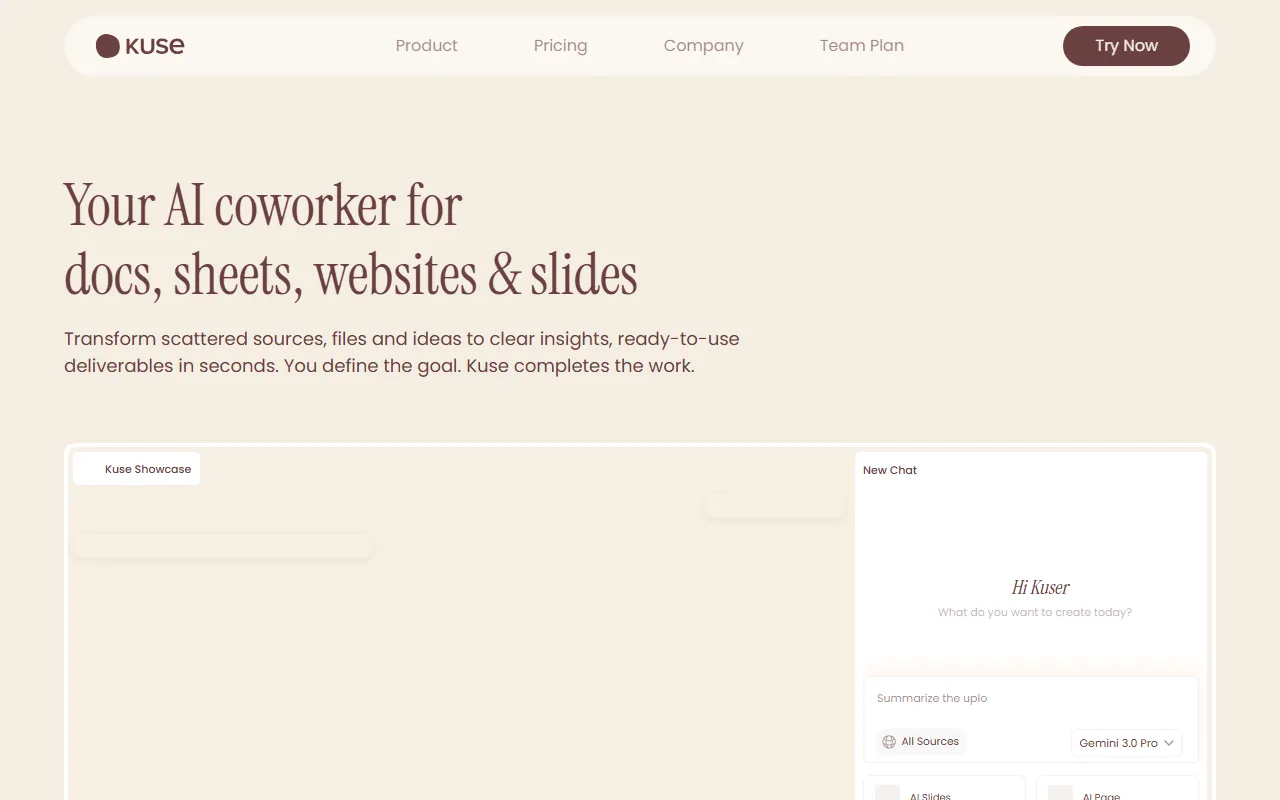 Kuse enters the AI Productivity arena as a purpose-built AI solution for professionals, teams, and business leaders. Kuse transforms diverse files into structured, visual deliverables with AI-powered, customizable workflows. In a market crowded with generic tools, Kuse distinguishes itself through its specialized focus on delivering measurable results in productivity and task management and a user experience designed to get you productive from day one.