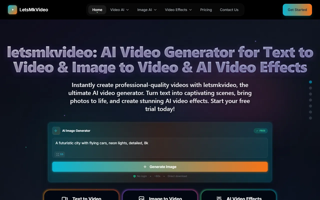 Letsmkvideo: free AI tool that creates professional, watermark-free videos from text and photos.
