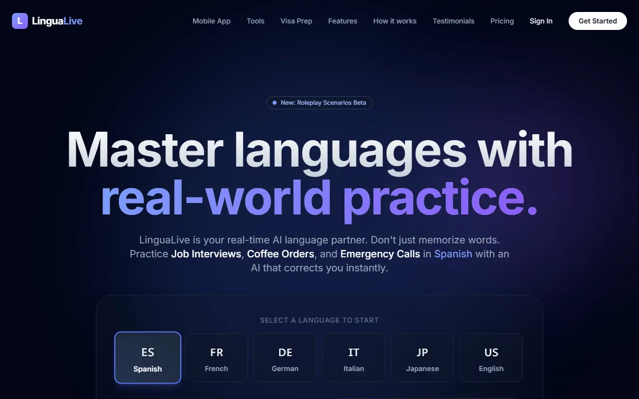 LinguaLive offers real-time AI conversations for practical language fluency with instant corrections.