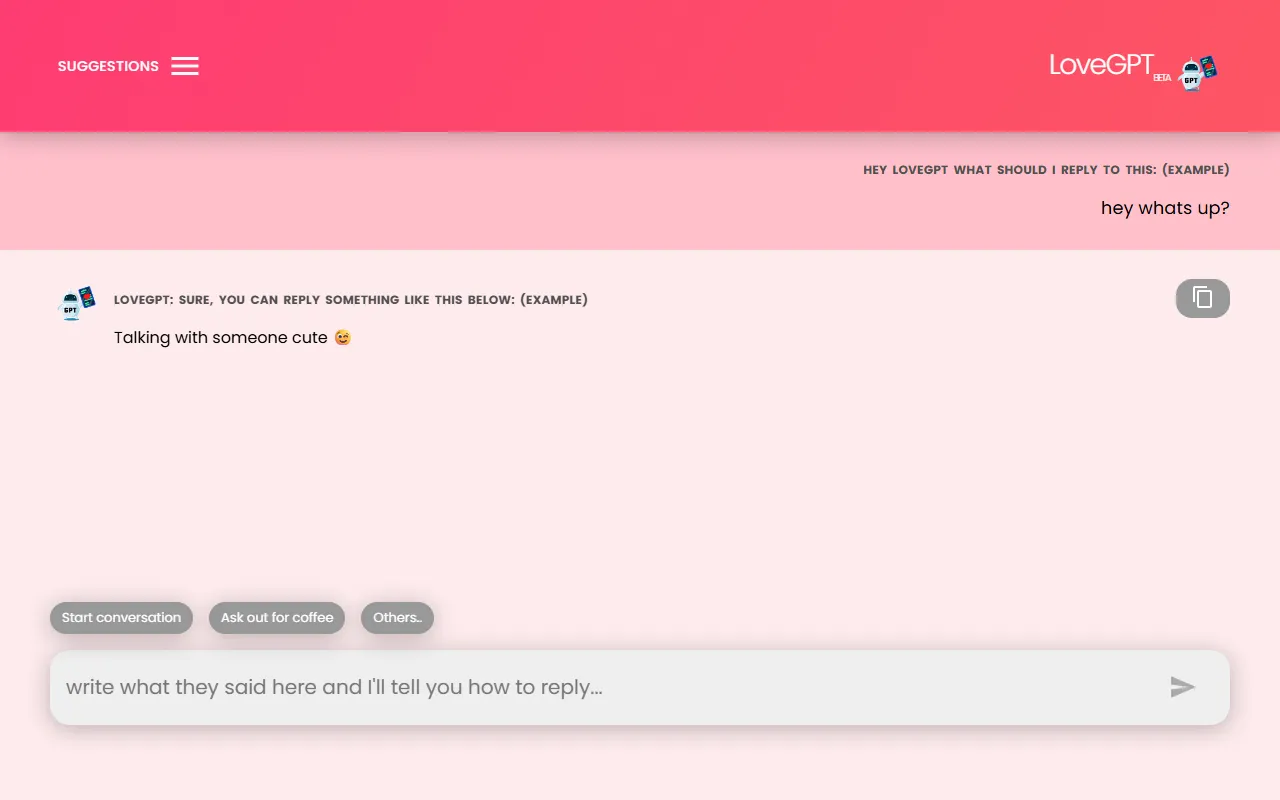 - AI for fun: LoveGPT provides robust ai for fun functionality, allowing users to resolve with precision and efficiency. This feature is powered by advanced AI models that adapt to your specific use case and improve over time based on your interactions.