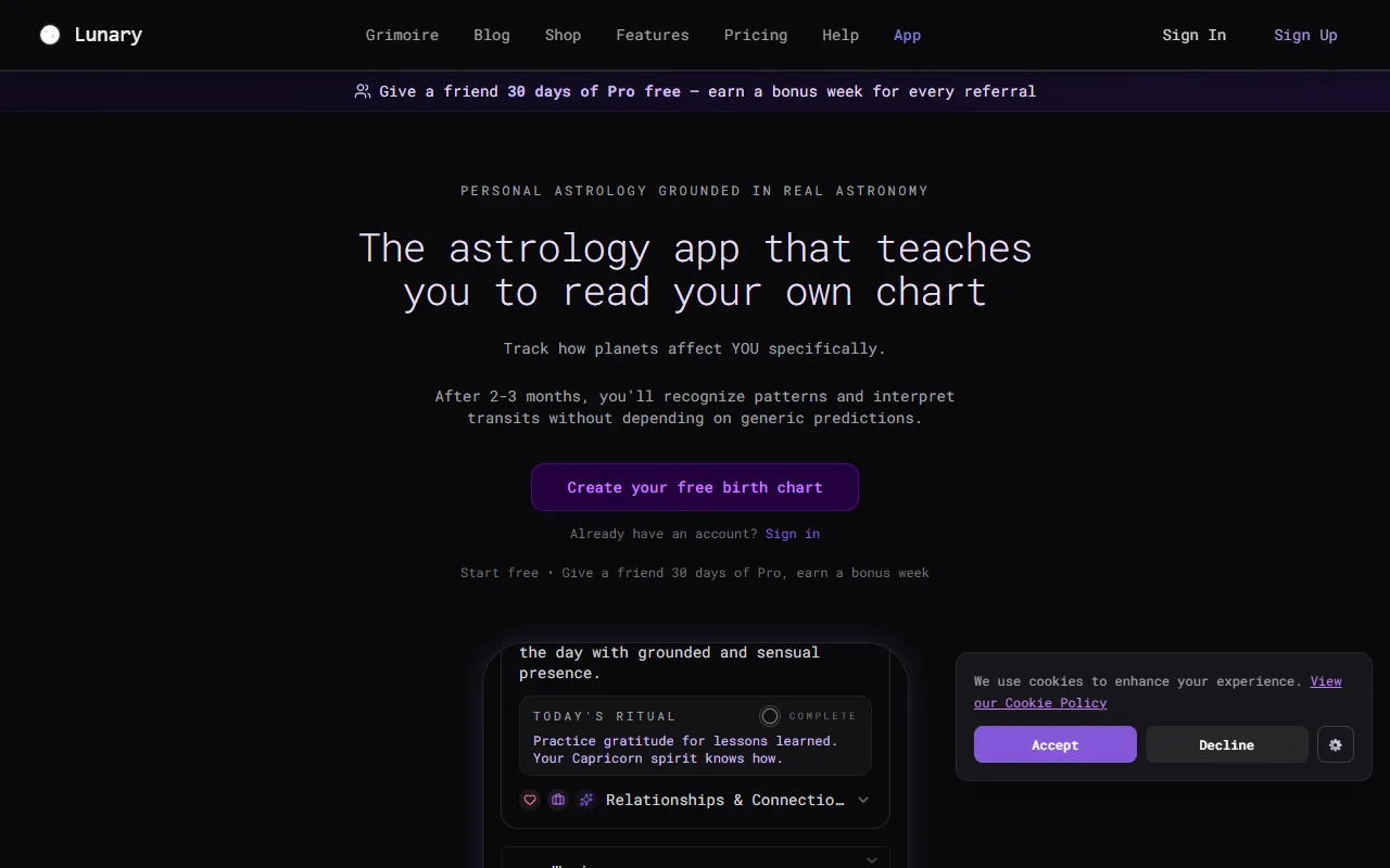 Lunary offers precise personalized astrology using real data, AI insights, and extensive cosmic tools.