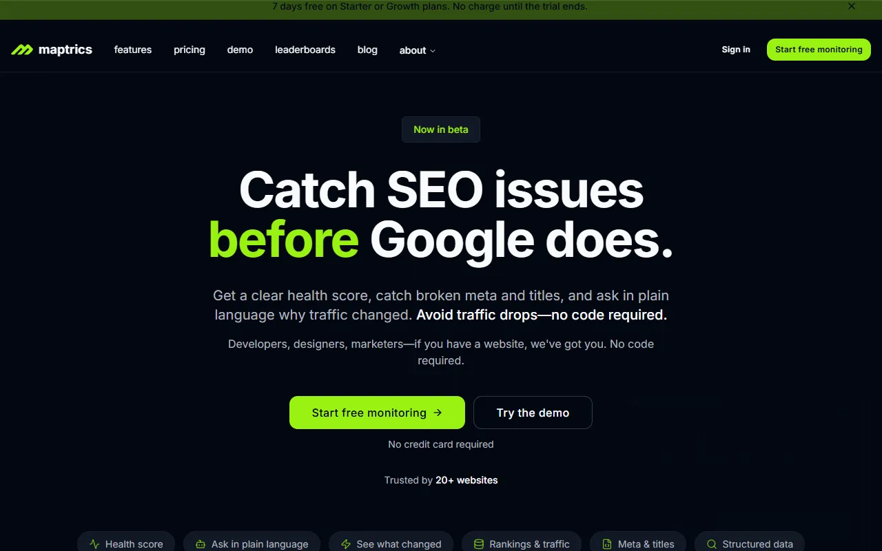 Maptrics monitors SEO health continuously, detects issues post-deploy, and tracks improvements over time.