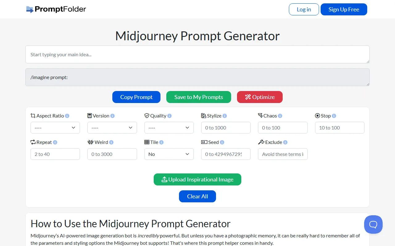 - Creative writing: MidJourney Prompt Tool includes a dedicated creative writing engine that processes your inputs intelligently. The system learns from each interaction, delivering increasingly personalized and accurate results the more you use it.