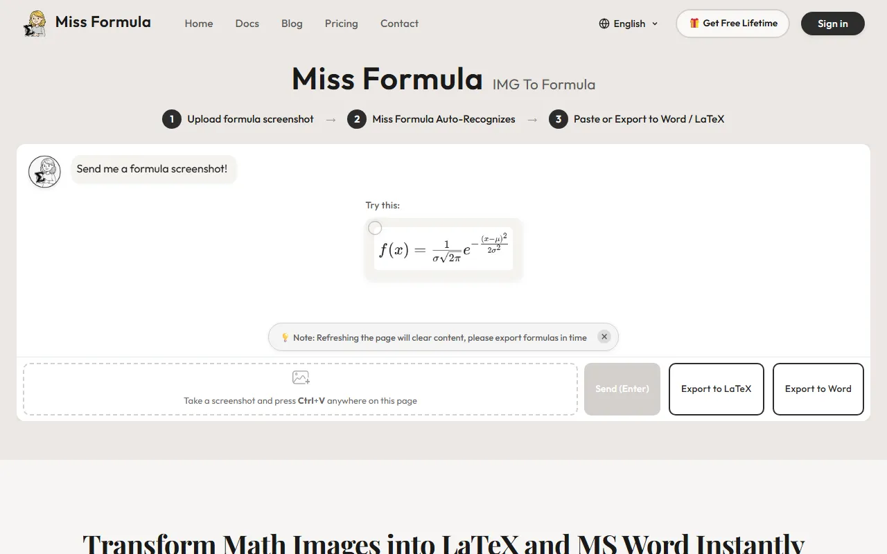 Miss Formula: Fast, web-based AI converts formula images to editable LaTeX and Word—no install needed.