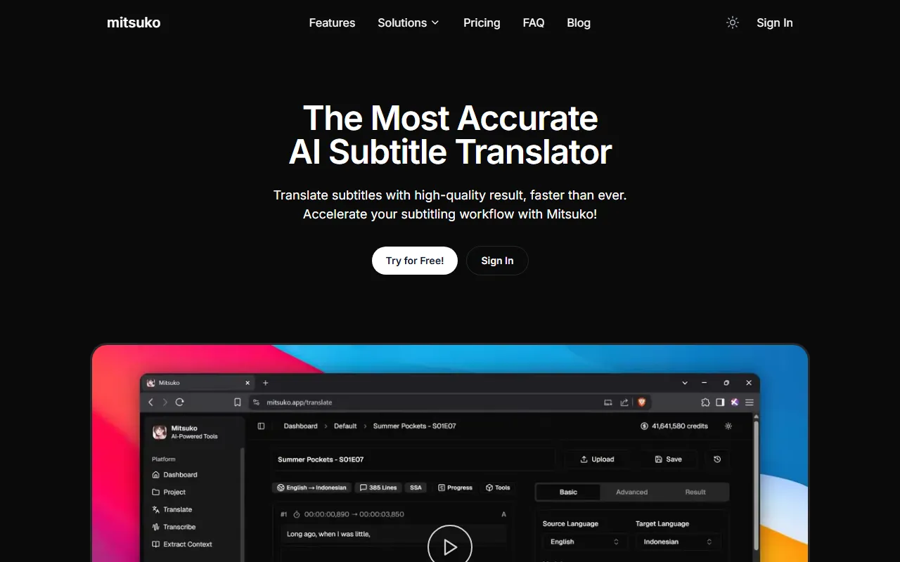 Mitsuko: AI-powered subtitle translation and transcription with context-aware, accurate results in 100+ languages.