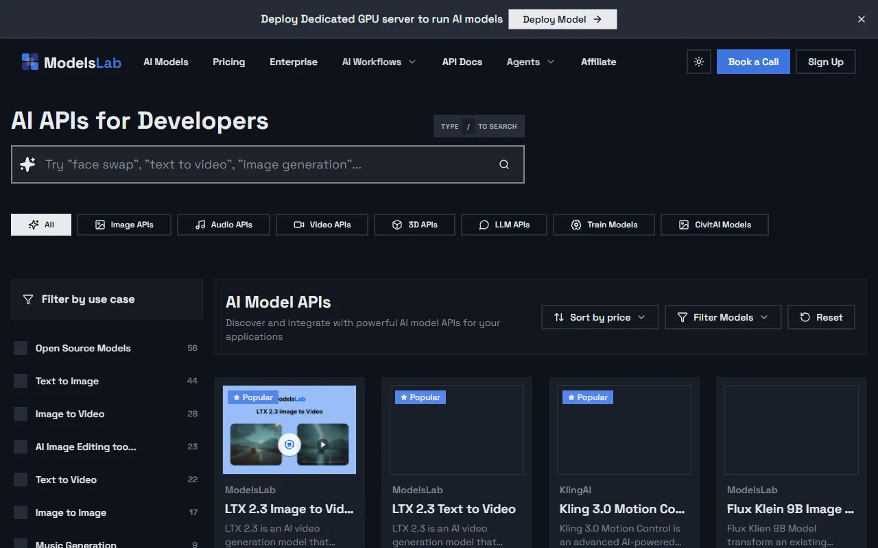 ModelsLab offers instant access to 100K+ AI models with scalable, GPU-free API deployment.