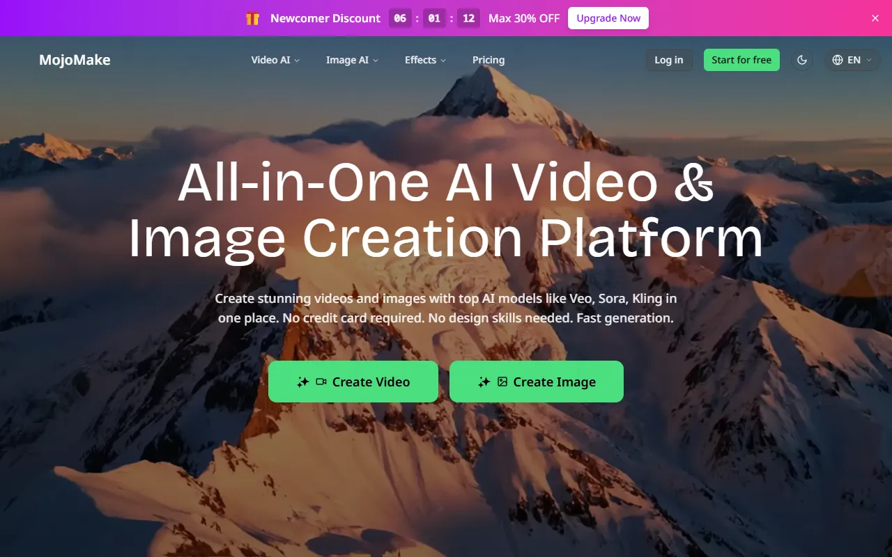 MojoMake: All-in-one AI studio for pro video, 4K images, viral effects, and easy content creation.