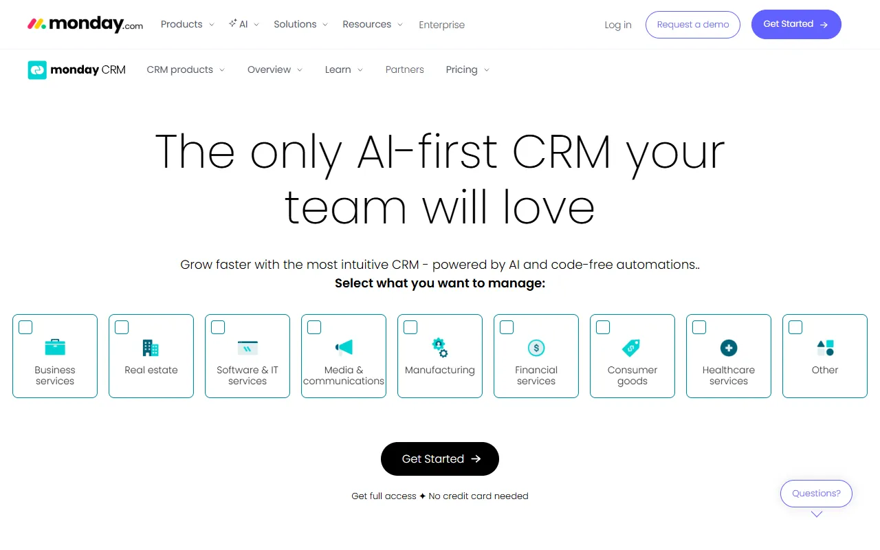 Monday CRM is a customer relationship management platform built on the monday.com Work OS that uses AI-powered Sales Agents and no-code customization to help sales teams manage their entire pipeline from lead capture to deal closure. Unlike traditional CRM systems that require extensive technical setup and administrator expertise, Monday CRM is designed to be configured and customized by sales teams themselves using an intuitive, visual interface that feels more like a project management tool than a complex enterprise application. The platform leverages the flexibility and usability that made monday.com one of the fastest-growing work management platforms in the world, applying those same principles to the specific challenges of sales pipeline management.