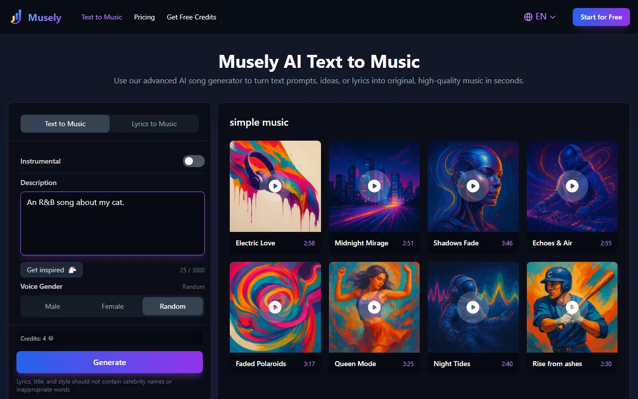 Musely.io instantly turns text or lyrics into original, studio-quality songs across genres.