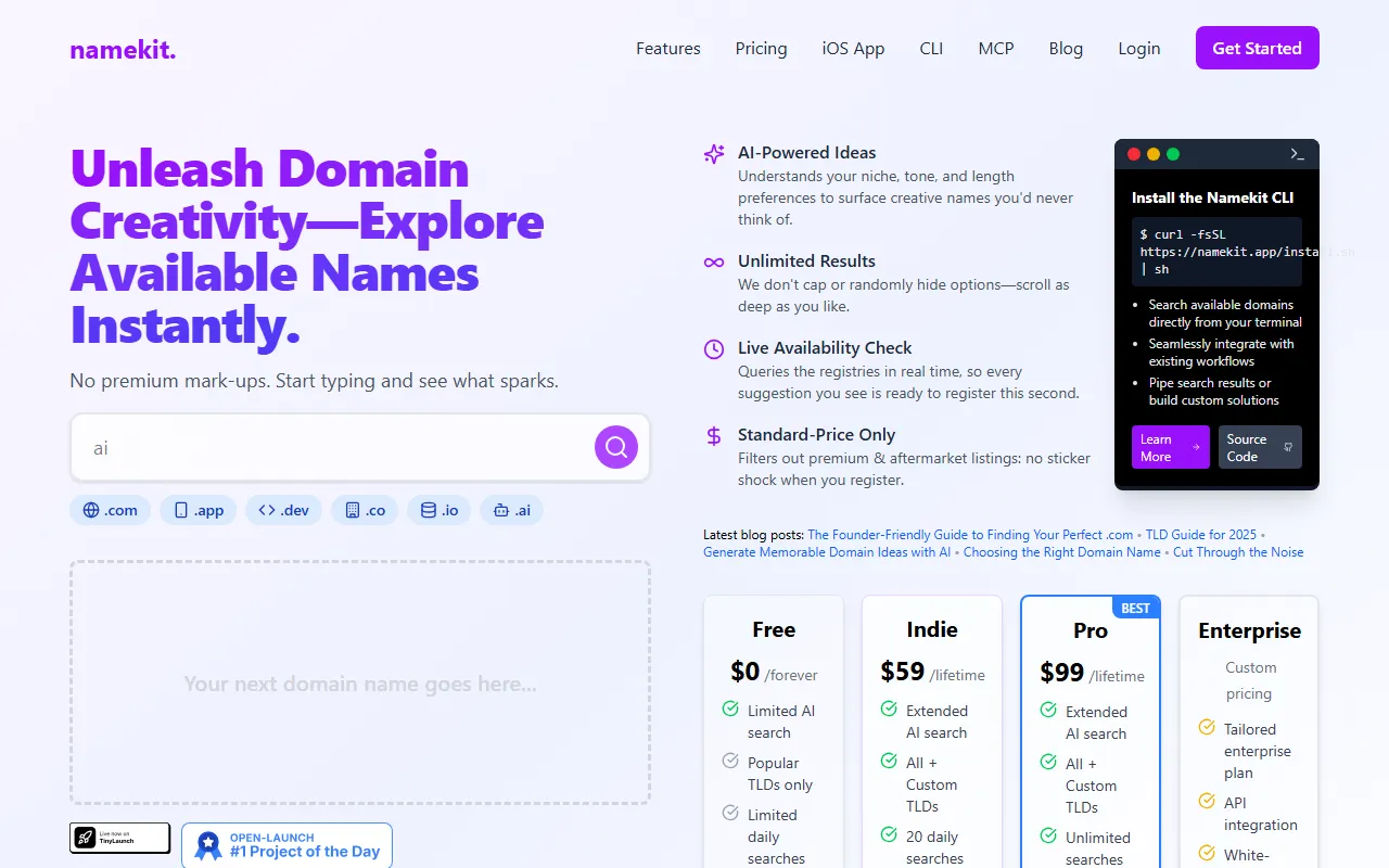 Namekit quickly generates brandable, available domain names with AI-powered, real-time suggestions.