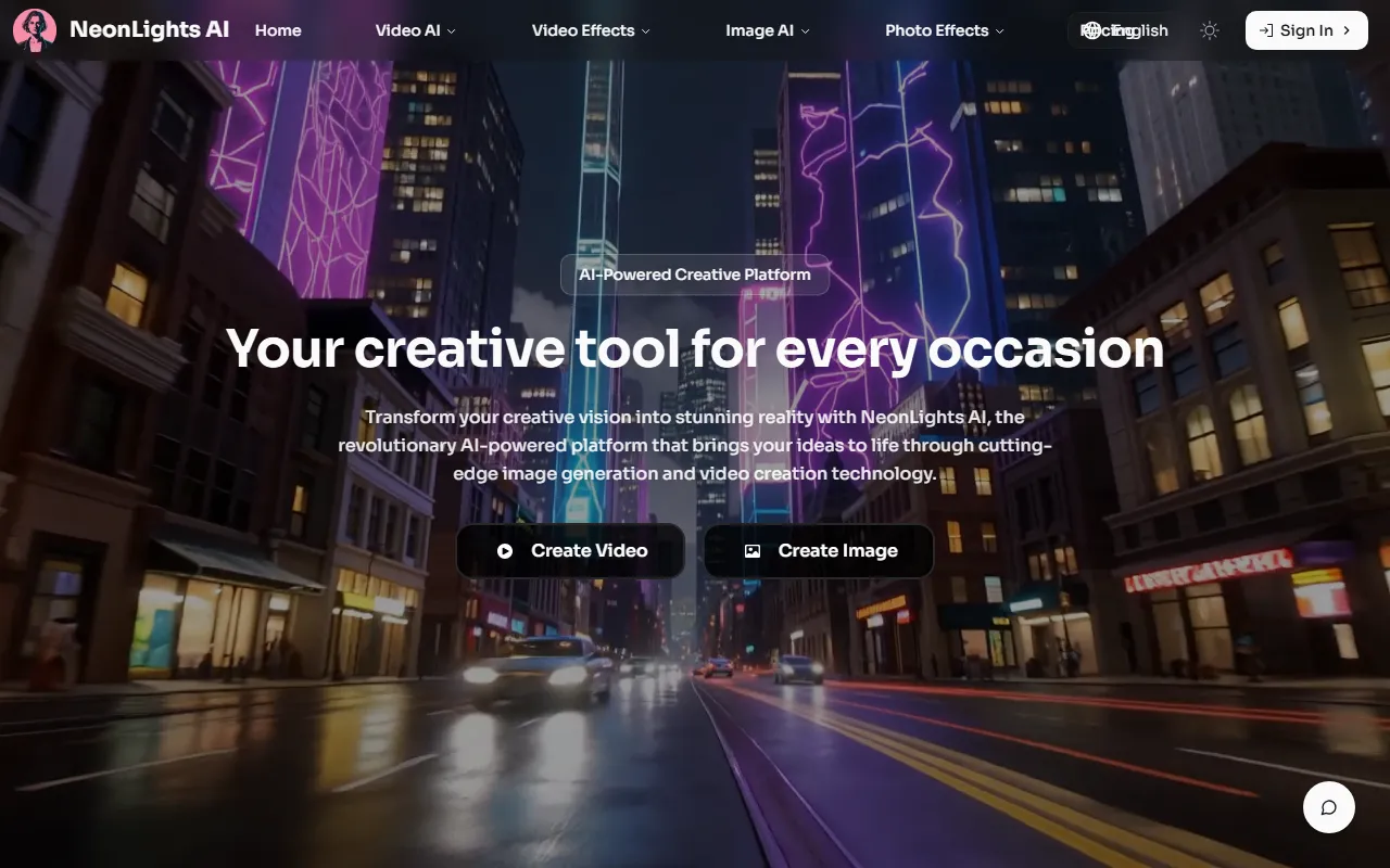 NeonLights AI creates stunning images and videos from text or images using advanced AI.