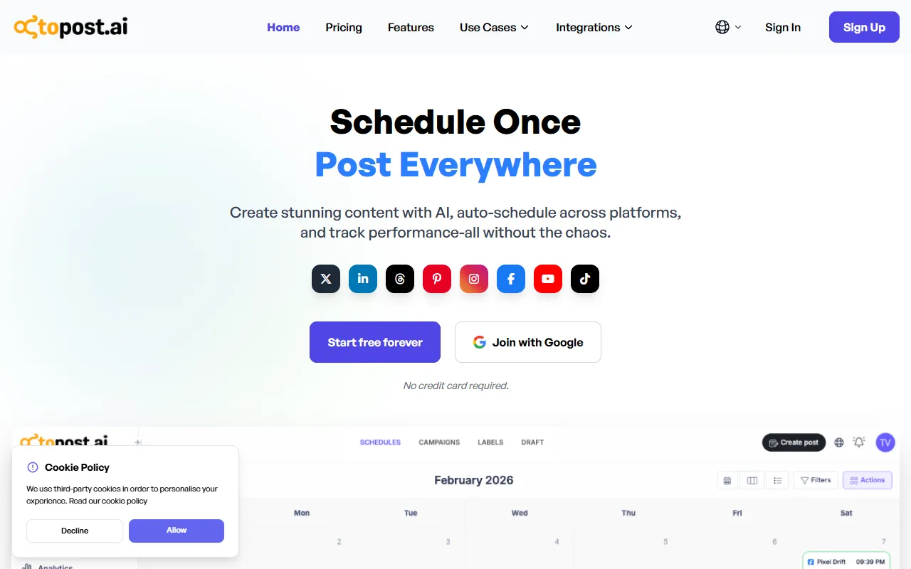 Octopost.ai: simple, AI-powered social media scheduler for seamless, cost-effective multi-platform content management.