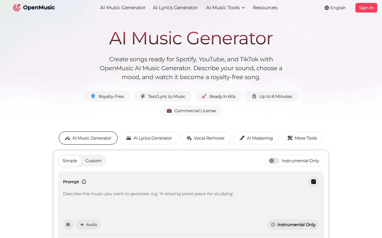 OpenMusic AI creates royalty-free, professional-quality songs instantly from text prompts and lyrics.