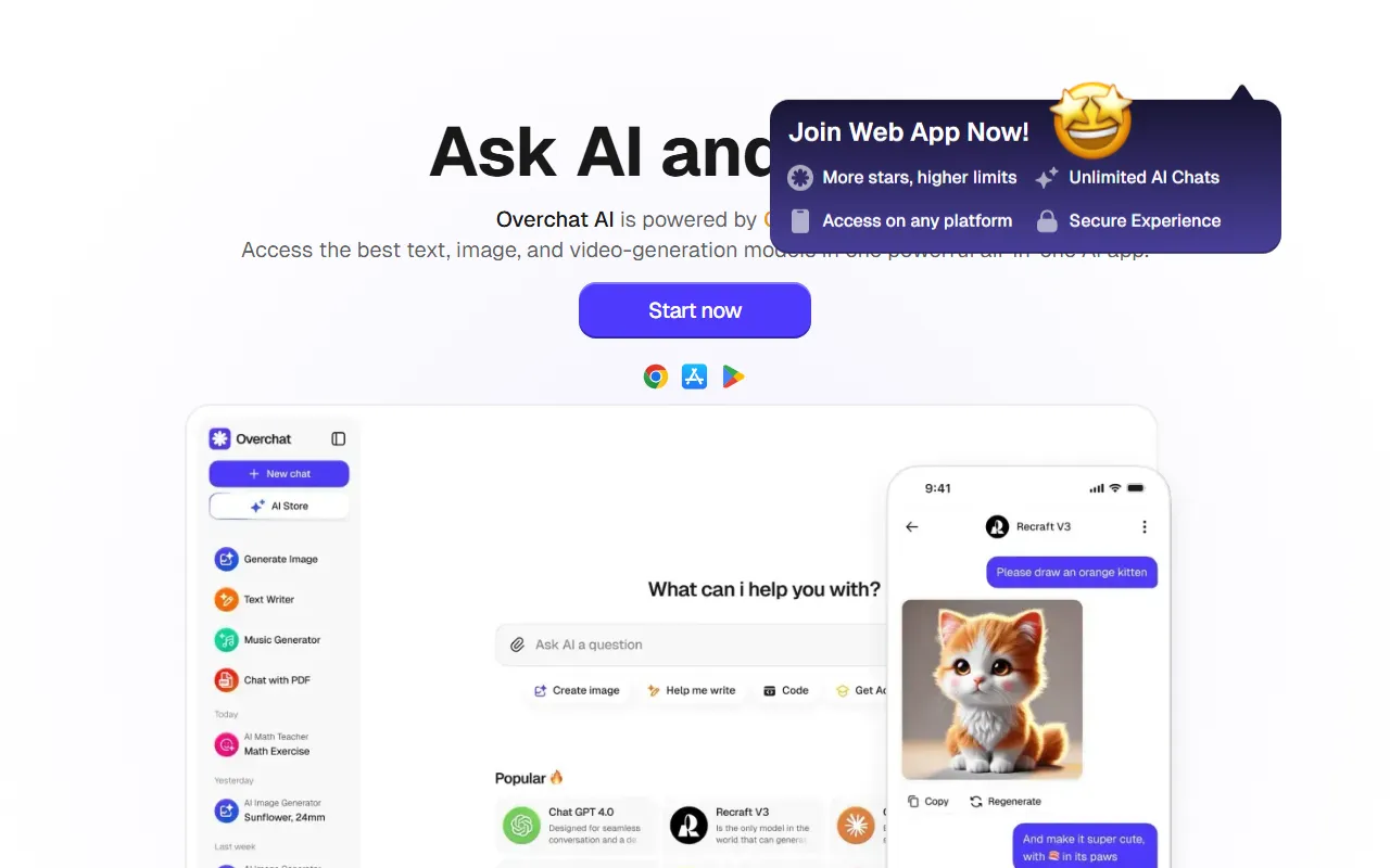 - AI content generation: Overchat AI provides robust ai content generation functionality, allowing users to create with precision and efficiency. This feature is powered by advanced AI models that adapt to your specific use case and improve over time based on your interactions.