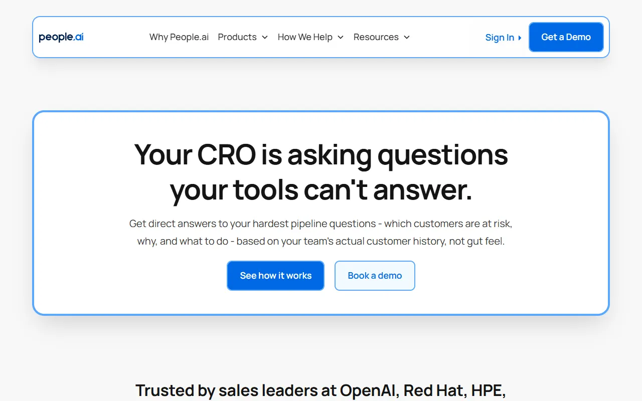 - Revenue intelligence: People.ai provides robust revenue intelligence functionality, allowing users to assist with precision and efficiency. This feature is powered by advanced AI models that adapt to your specific use case and improve over time based on your interactions.