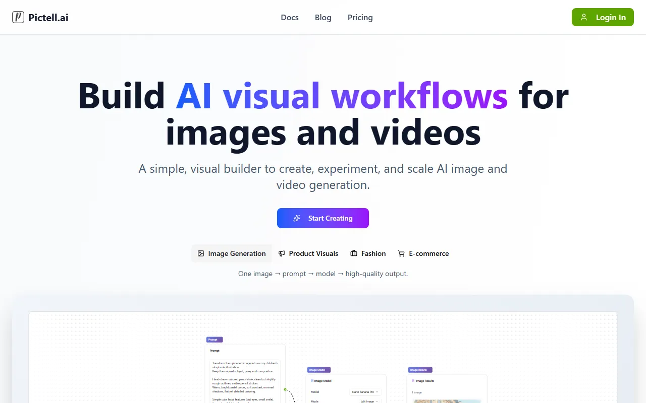 Pictell: Visual AI workflows for creators, enabling easy, reusable, multi-modal content automation.