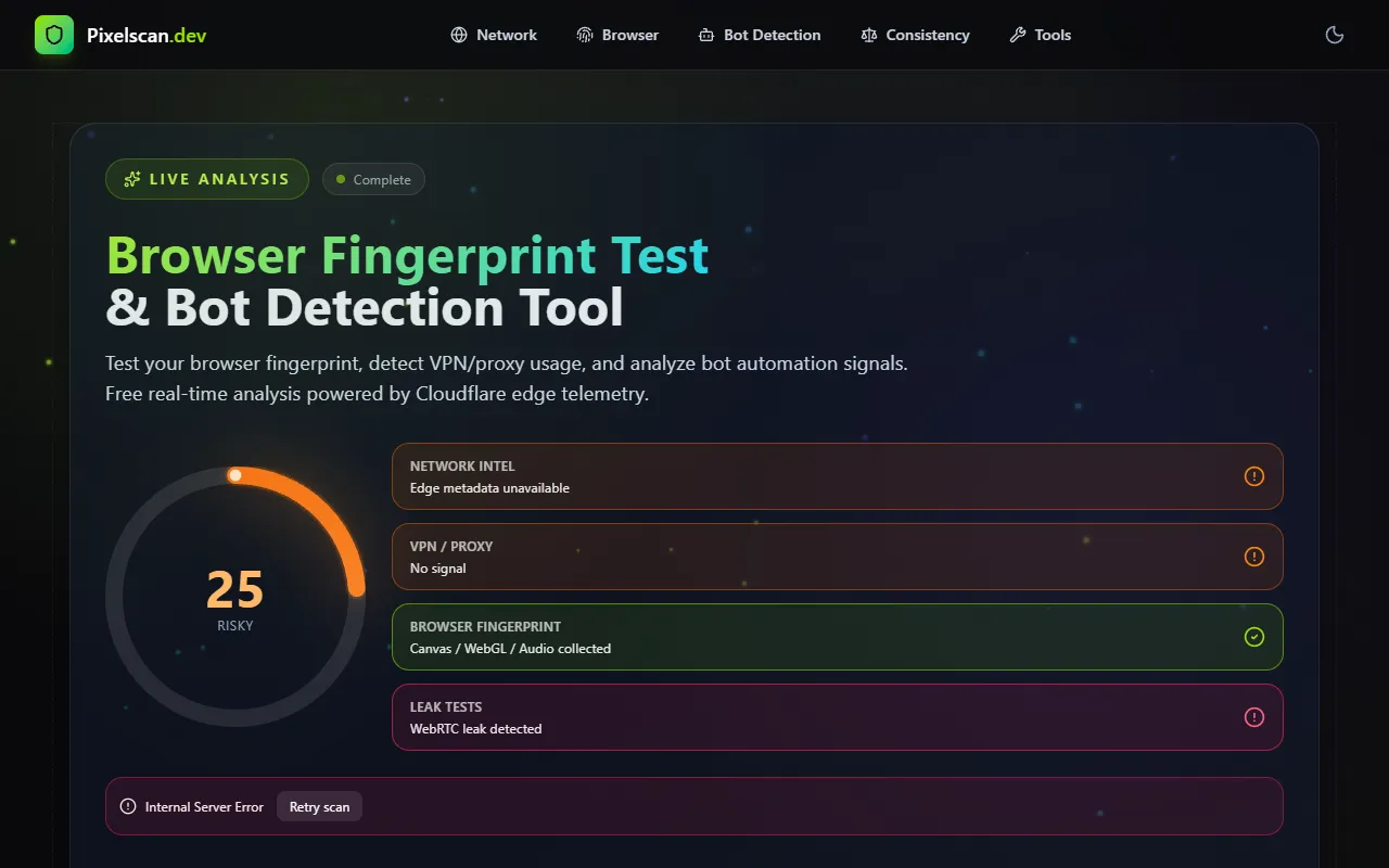 Pixelscan.dev delivers real-time browser fingerprinting and bot detection with explainable risk scoring.