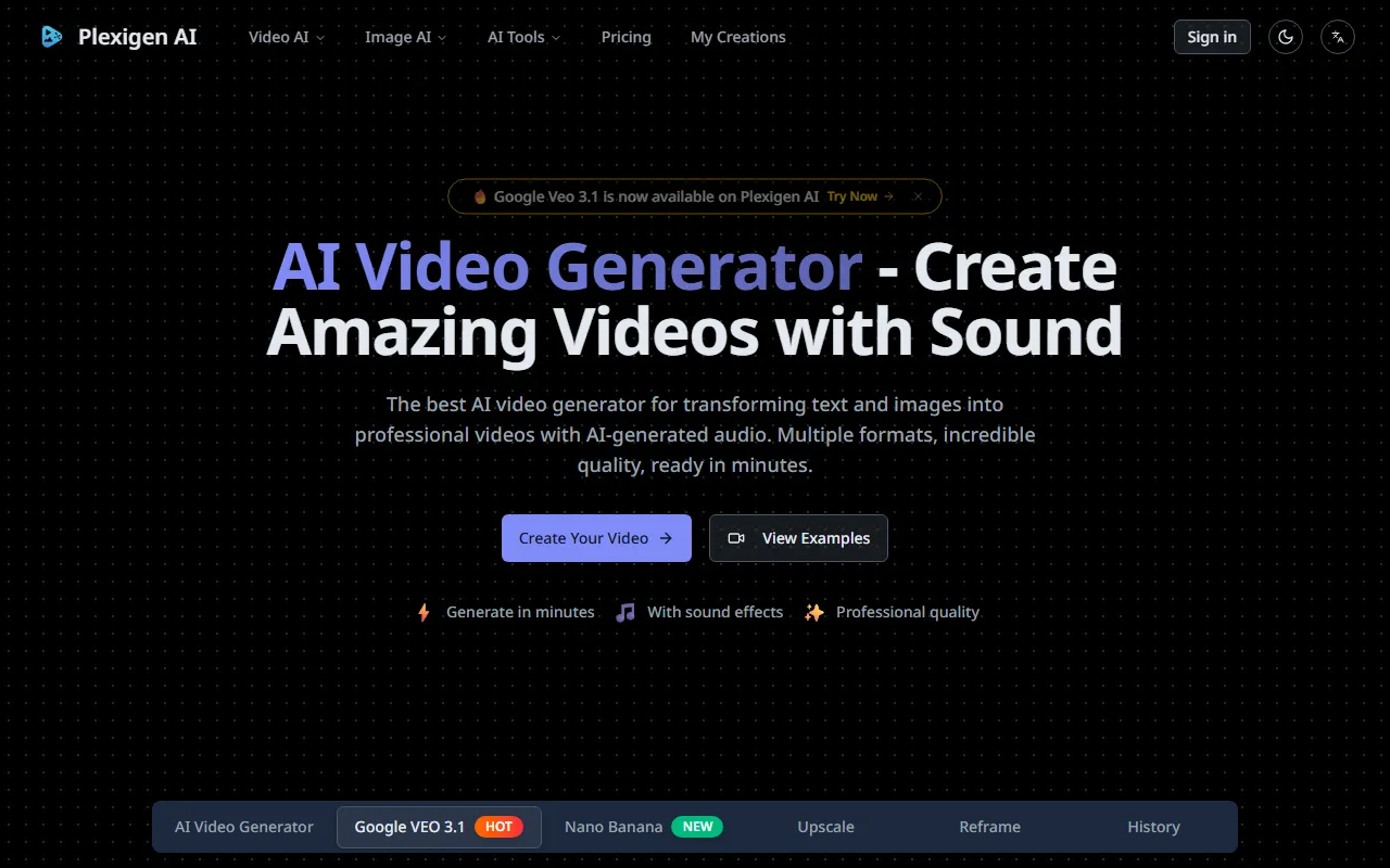 - AI video creation: Plexigen AI - AI Video Generator with Sound provides robust ai video creation functionality, allowing users to generate with precision and efficiency. This feature is powered by advanced AI models that adapt to your specific use case and improve over time based on your interactions.