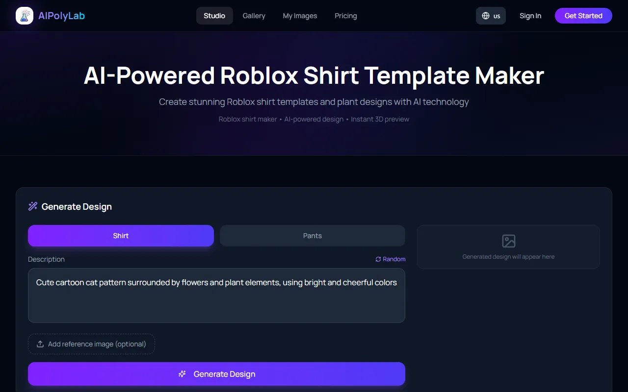 AI-powered Roblox clothing and plant design tool for fast, easy, professional-quality templates.