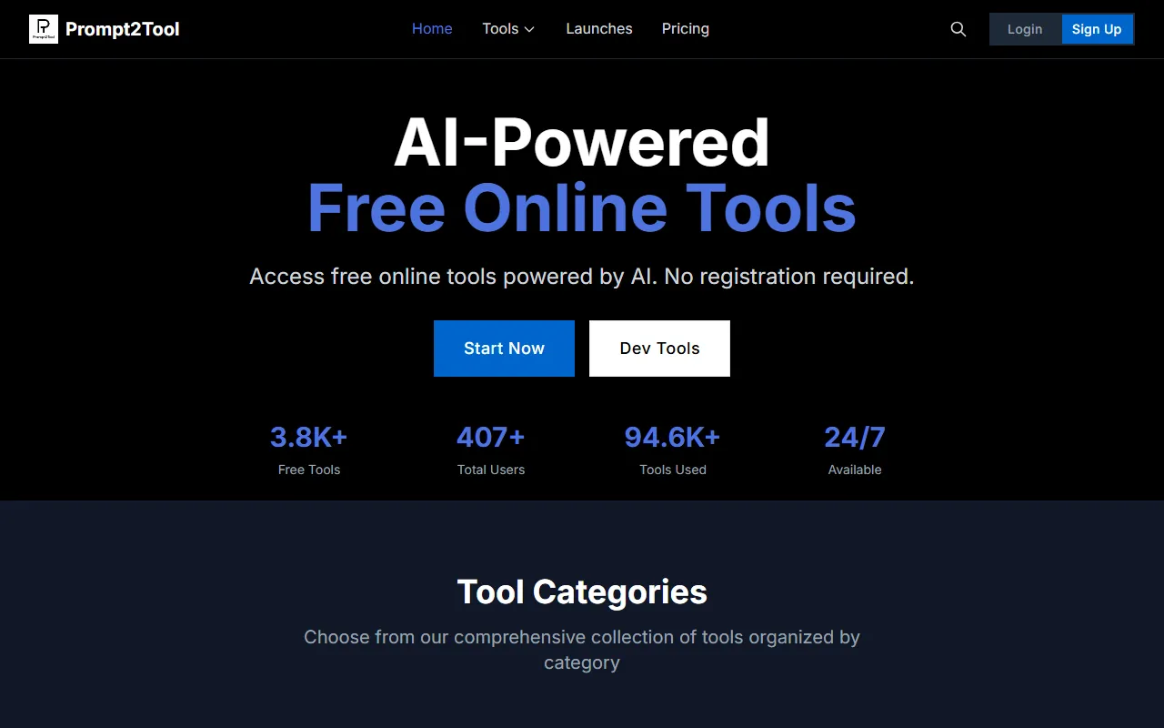 Prompt2Tool offers 200+ free, instant AI utilities for developers, designers, marketers—no signup needed.