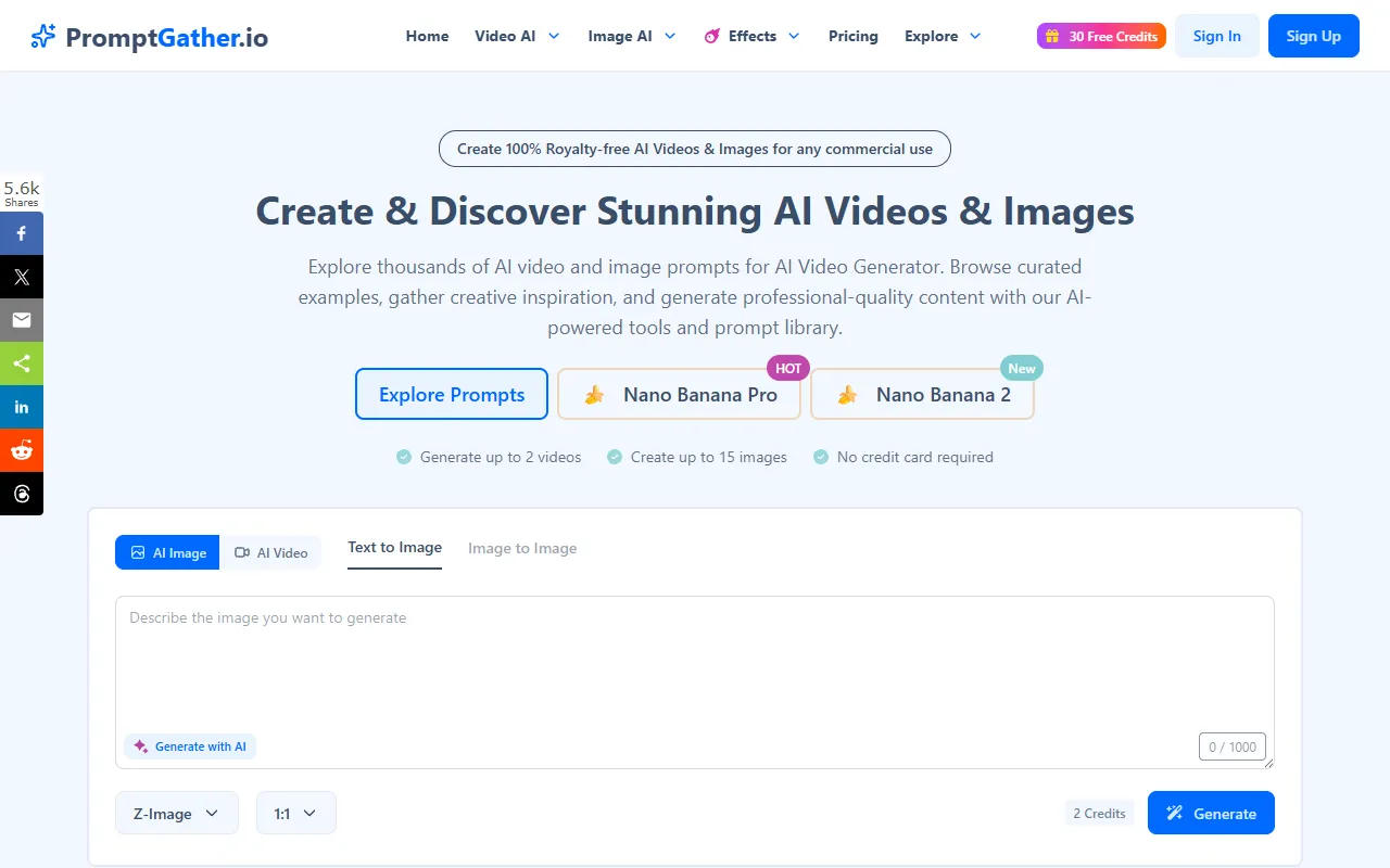 PromptGather.io offers a curated AI prompt library with browser-based image and video generation for creative exploration.