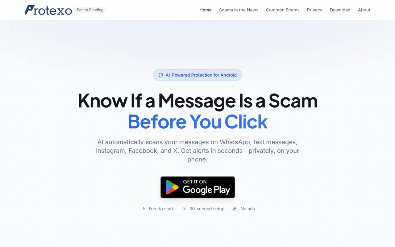 Protexo uses AI to detect scams and malicious links in WhatsApp and SMS instantly.