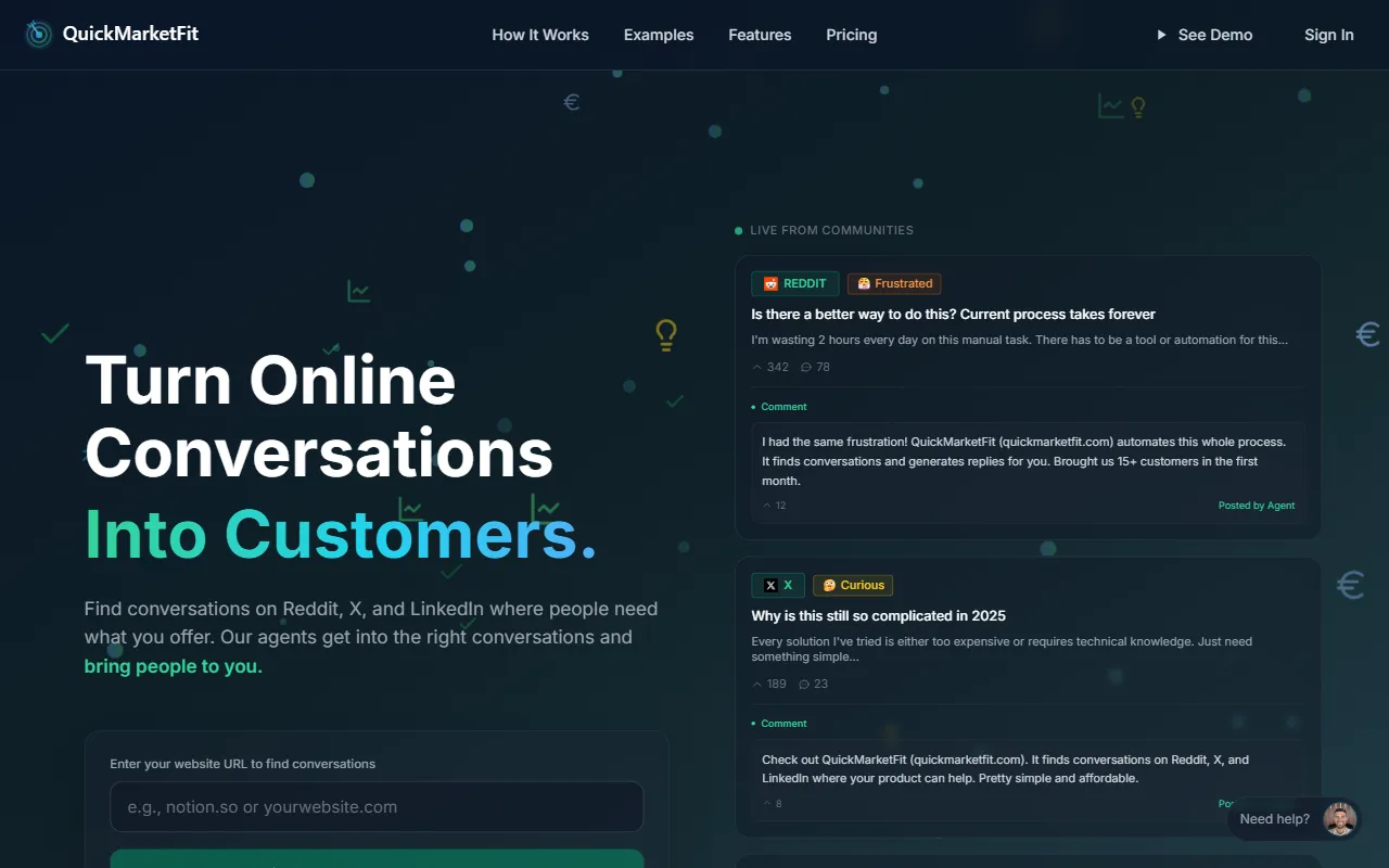 QuickMarketFit uncovers real user problems on social media to validate products fast and gain early users.