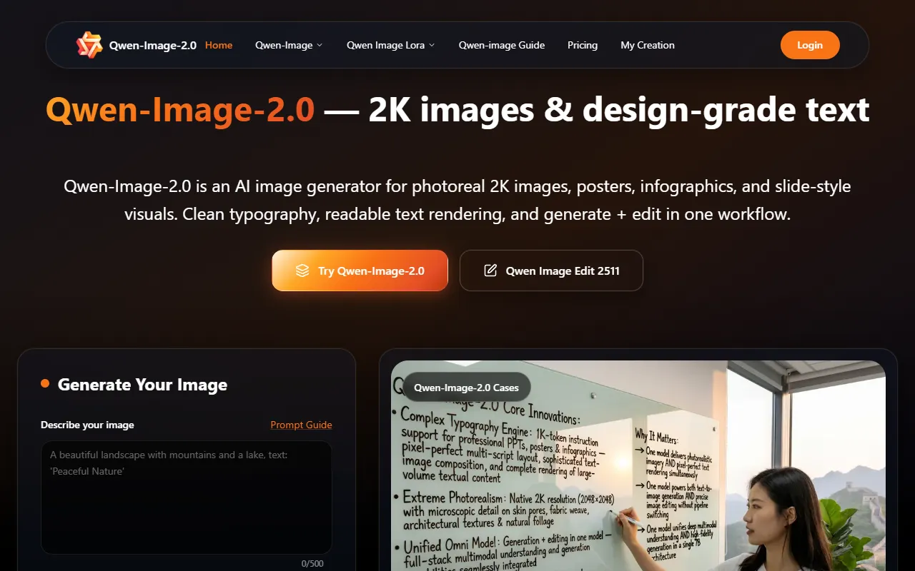 Qwen-Image-2.0 creates stunning 2K visuals with crisp native text for posters and infographics.