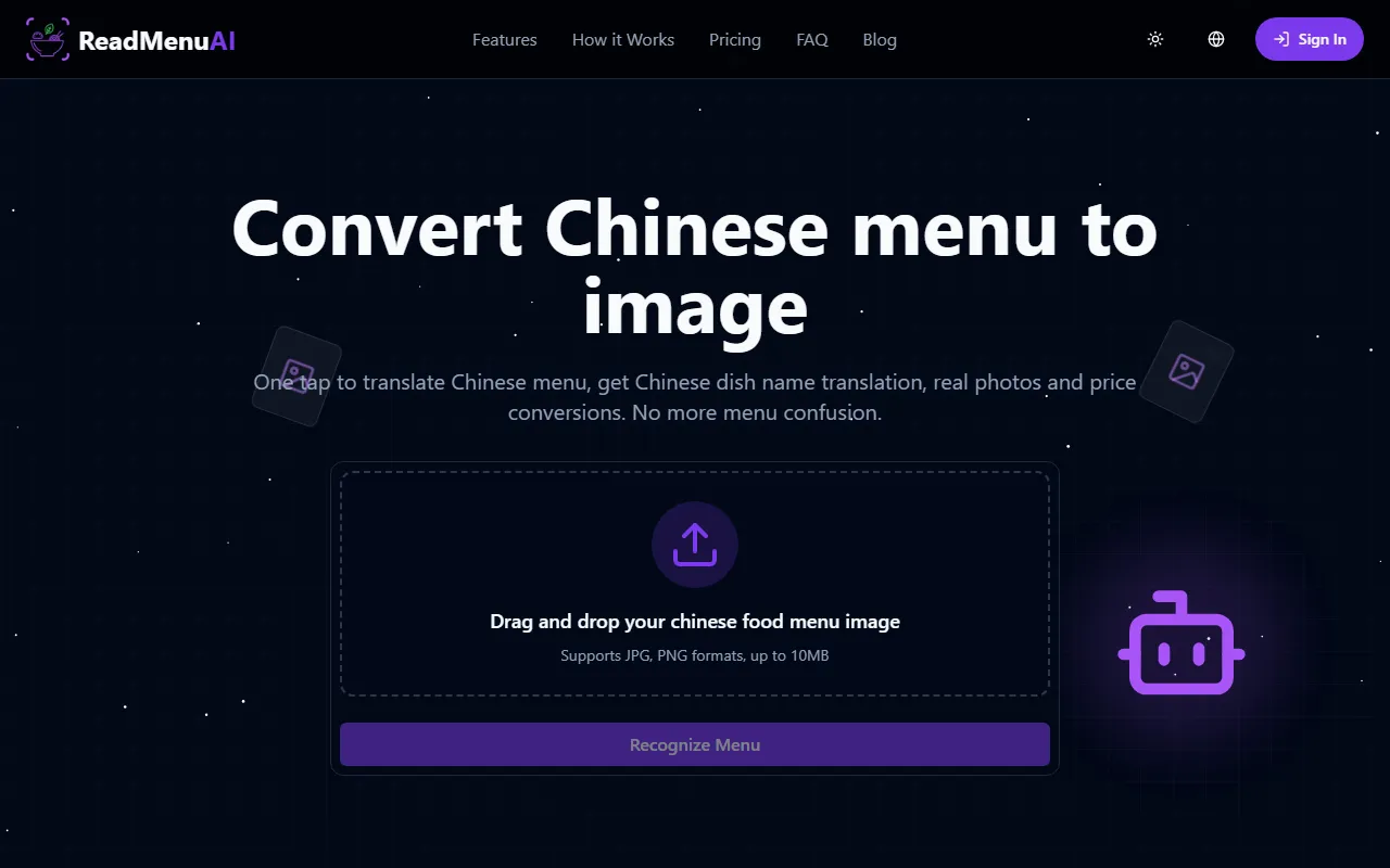 ReadMenuAi translates Chinese menus with AI, offers dish images, ingredient details, and real-time currency conversion for travelers.