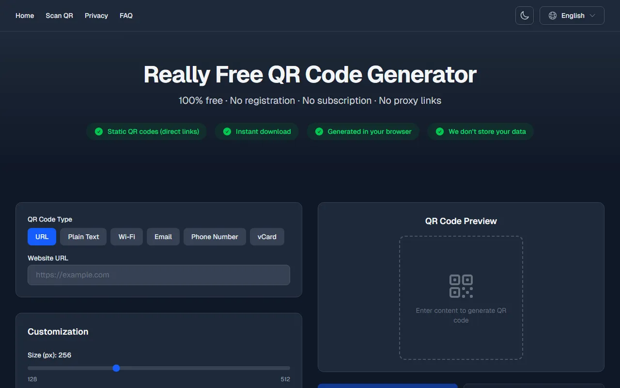 Privacy-first QR code generator offering free, customizable, no-account, watermark-free static codes.