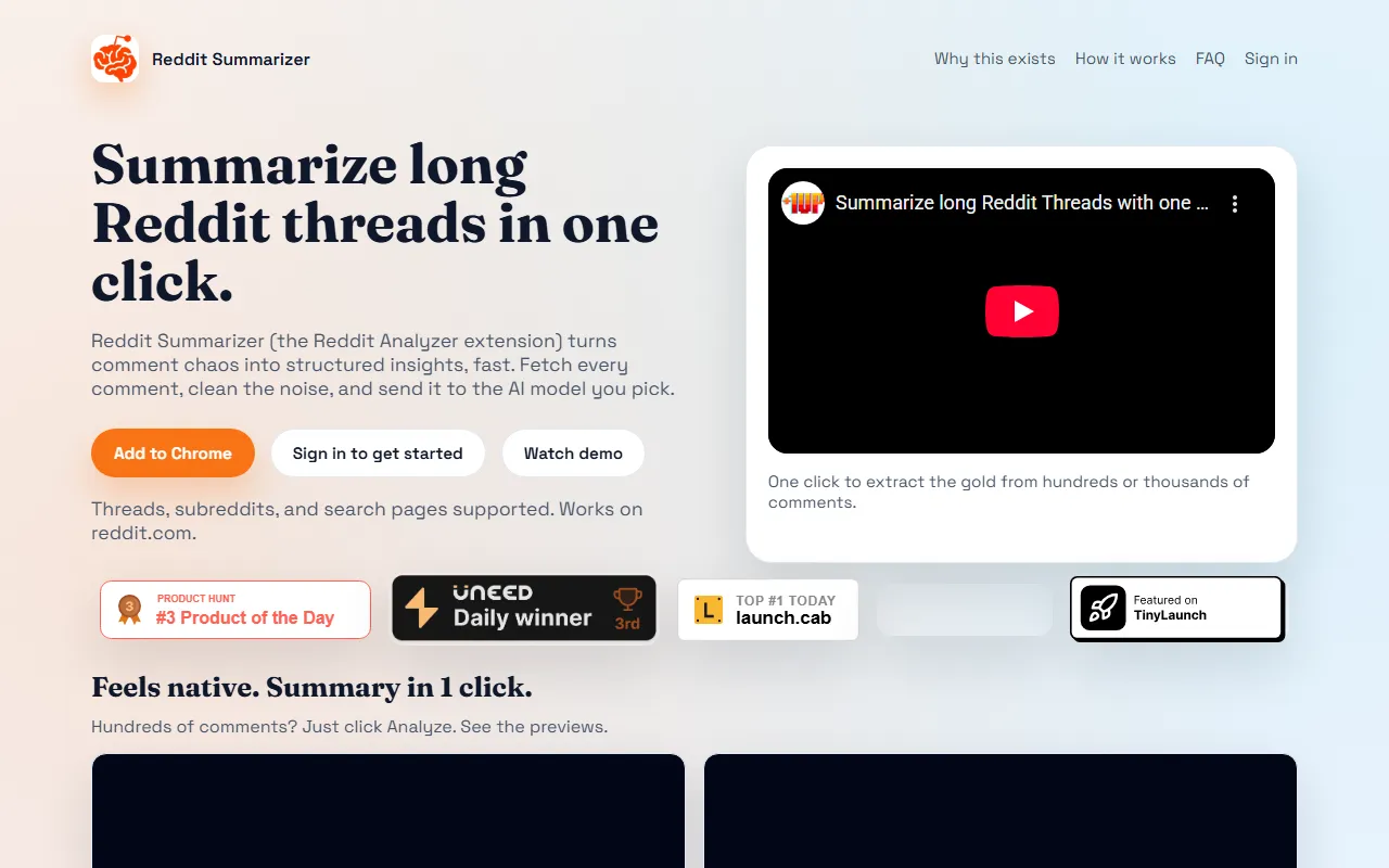 AI-powered Chrome extension that instantly summarizes Reddit threads, revealing top insights and saving time.