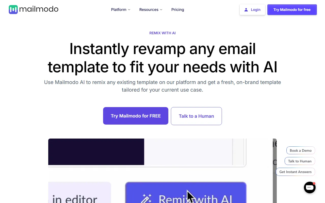 Remix with AI by Mailmodo transforms and customizes email templates quickly for effective campaigns.