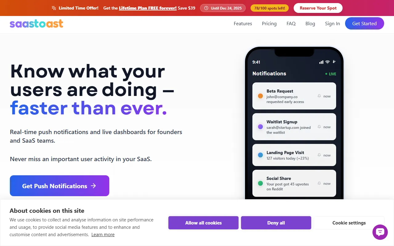 Saastoast boosts indie hackers’ motivation by tracking product signals with instant, privacy-friendly notifications.