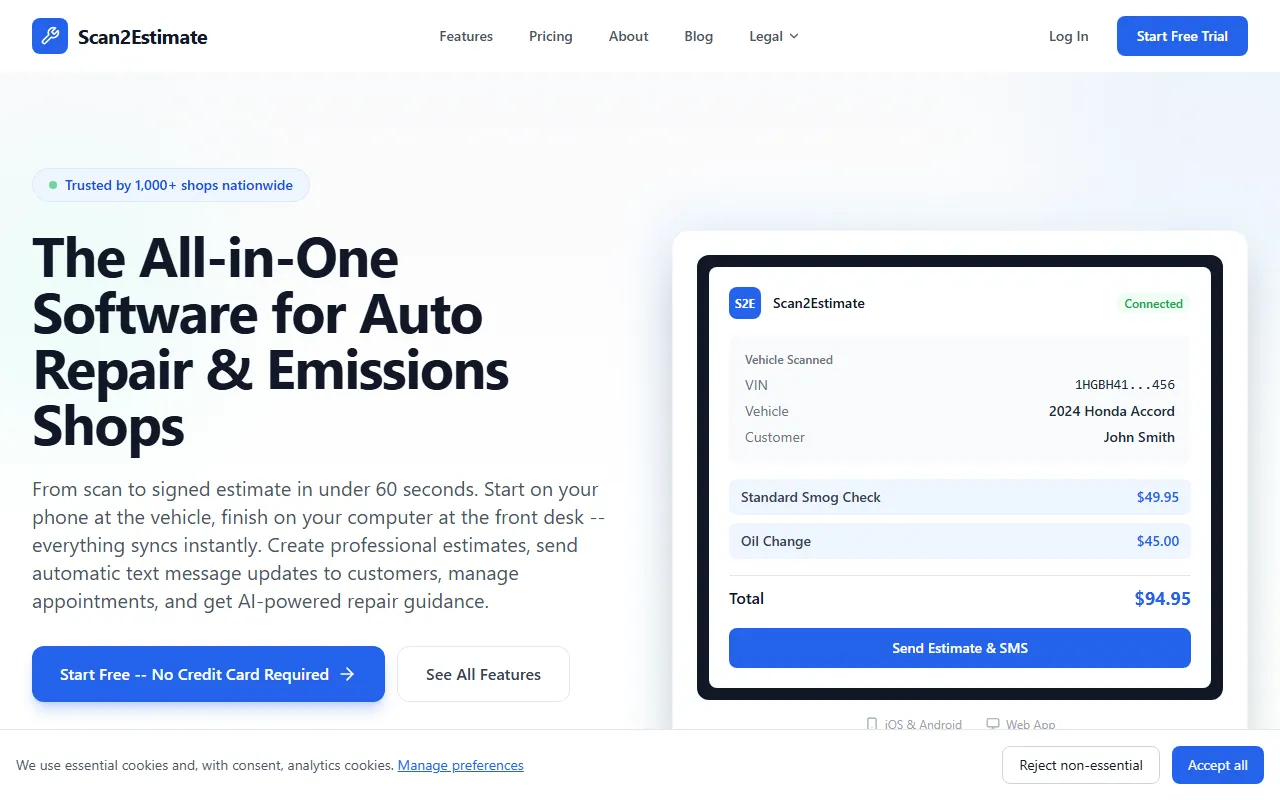 Scan2Estimate streamlines auto repair with AI-powered estimates, vehicle scanning, and automated customer updates.